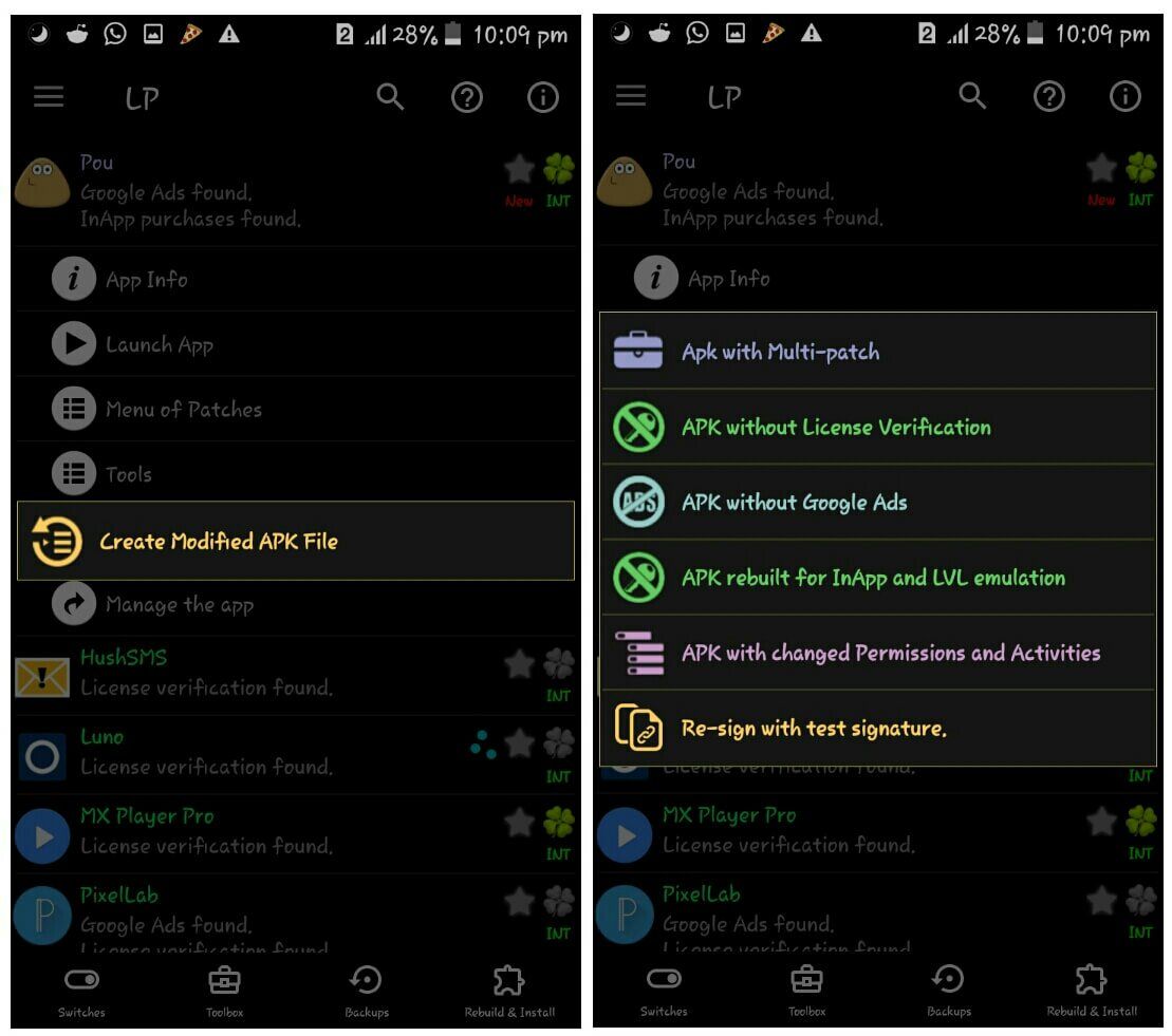 With the app installed, simply fire it up and if prompted, allow to update so that the latest patches will be available to you. Now select Pou from the list and hit the option that says Menu of Patches followed by Create Modified APK File.